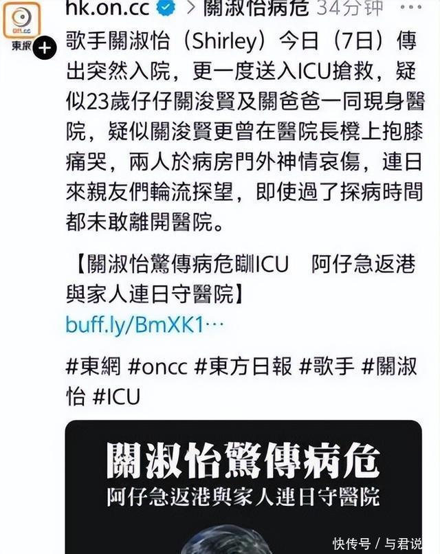 10月7日,媒体爆出关淑怡病危,被紧急送入ICU抢救。 她的儿子和其爸爸一起现身医院,两人一起在病房外神情看起来十分哀伤。 还有人拍到了她的儿子关浚贤,一个人在医院长凳上抱膝痛哭。